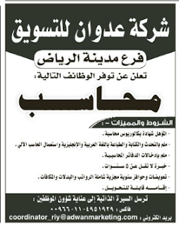 مطلوب محاسب لشركة عدوان للتسويق فرع مدينة الرياض
